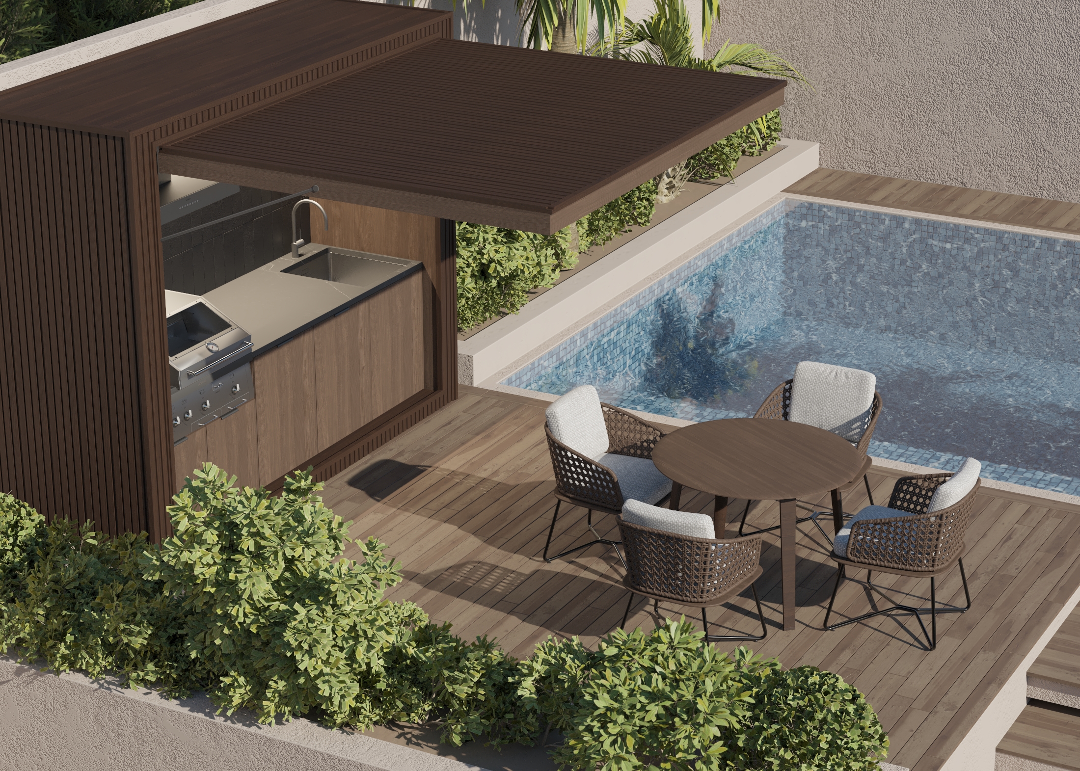 Our Barbecue Pod brings a minimalist pavilion form with a dedicated grill bay and prep surfaces, offering a polished, resort-style cookspace.